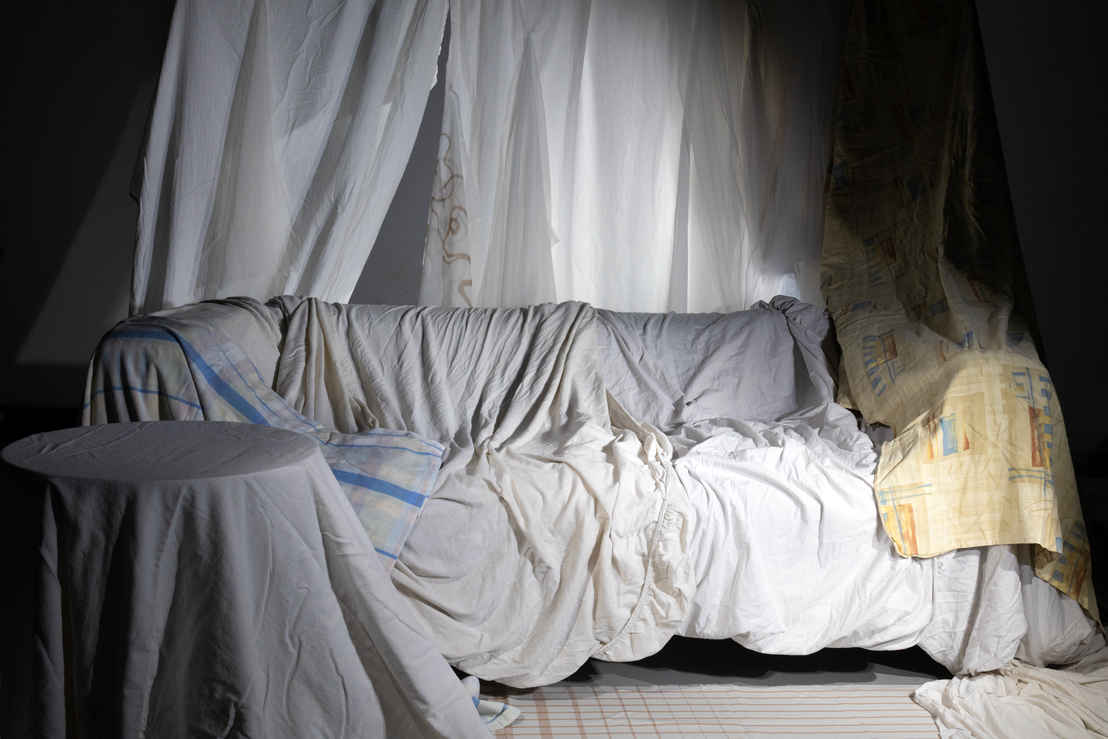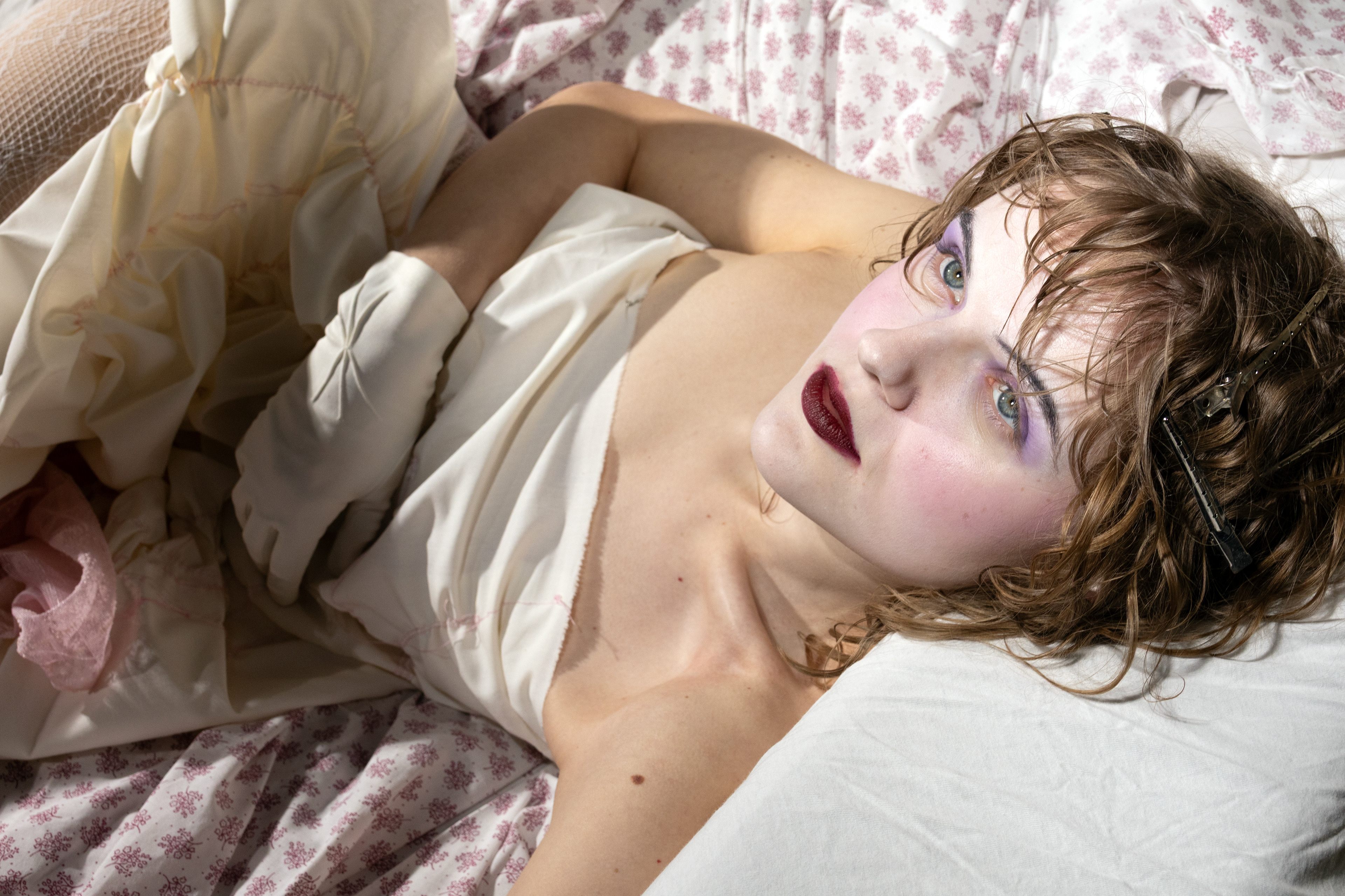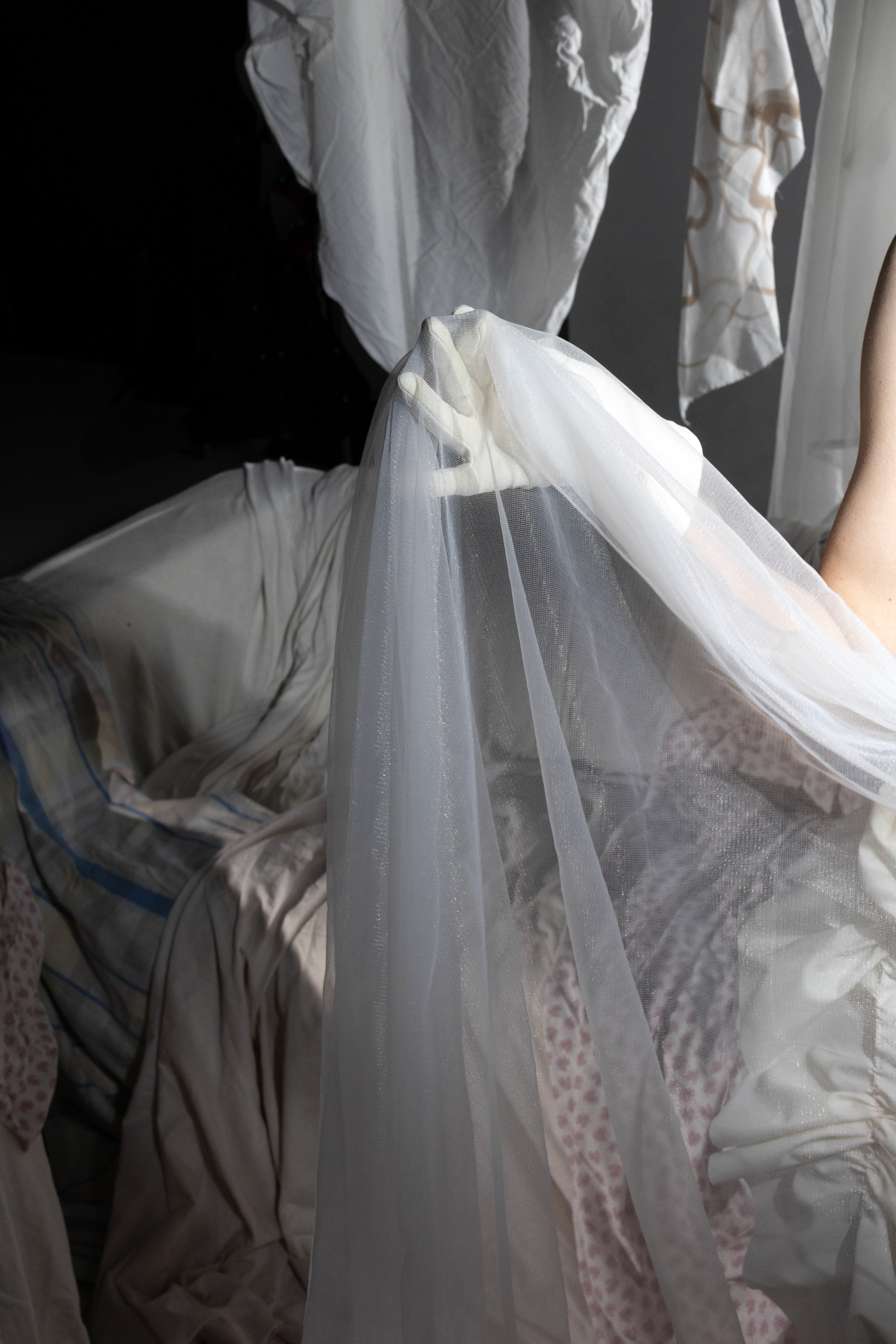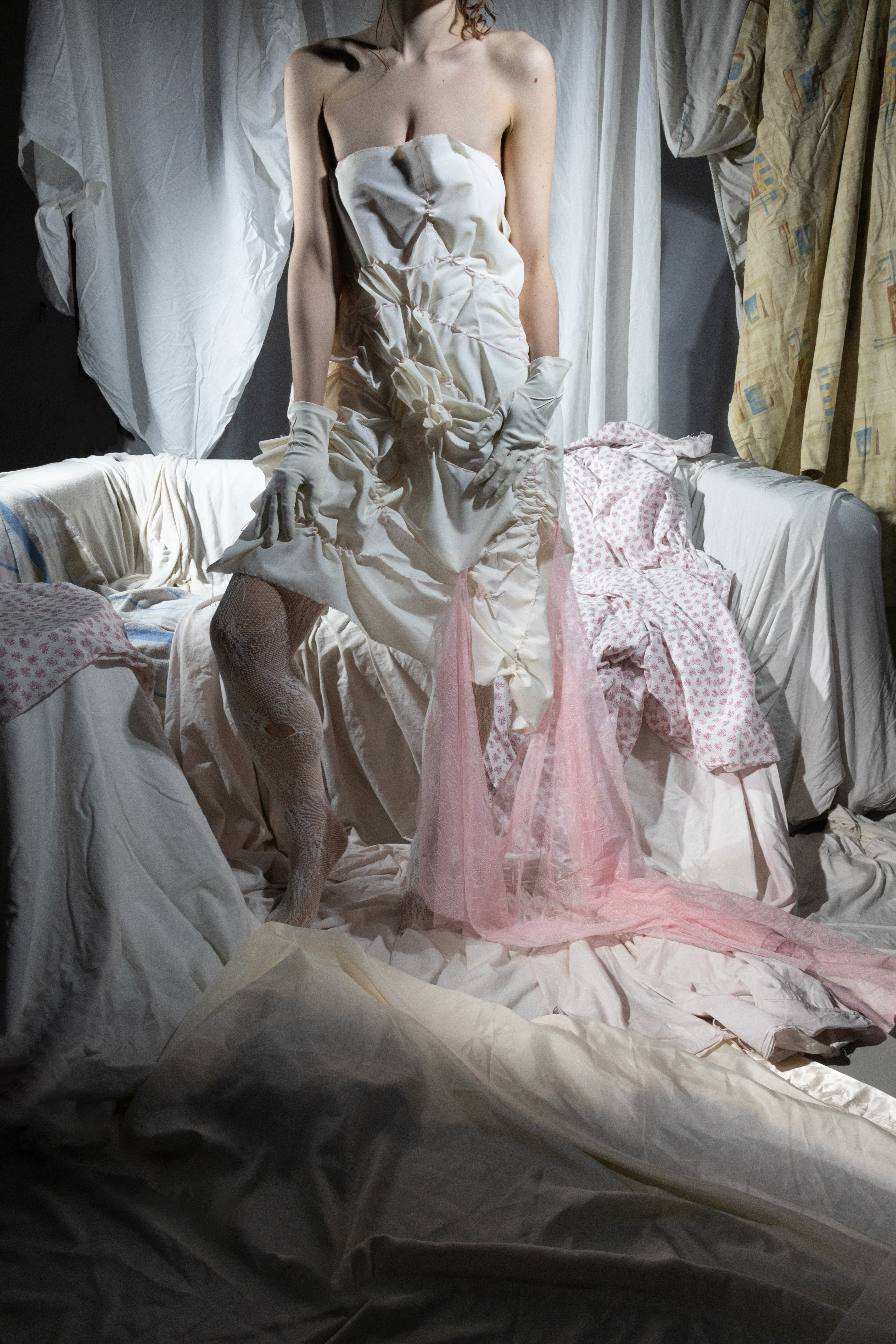 In Metanoia, a woman experiences a rebirth, she dies in a capitalist world and is reborn into a utopian one. The current world is shown as one of low quality, excessive textiles, while the utopia reveals how objects can be reused in fashion, where garments become sculptural, almost like wearable art. Metanoia confronts the viewer with their own consumption habits and challenges the traditional value of objects. By transforming everyday items into bodily sculptures and presenting them in a luxurious way, the line between the cheap and the exclusive begins to blur. This creates a new kind of aesthetic, one that invites the viewer to see value and beauty in a different light.